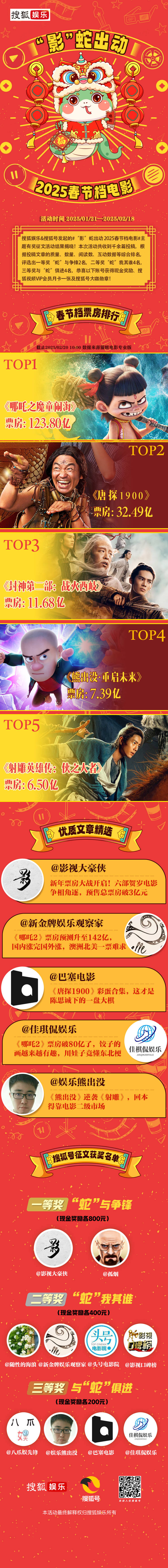 2025年1月21日至2025年2月18日,搜狐娱乐&搜狐号发起#“影”蛇出动 2025春节档电影#春节档主题有奖征文活动。搜狐号作者可针对影片从票房预测分析、主创表现和内容剖析等多角度展开创作,鼓励搜狐号作者们积极投稿,活动期间收到千余投稿,目前此征文活动已圆满结束!