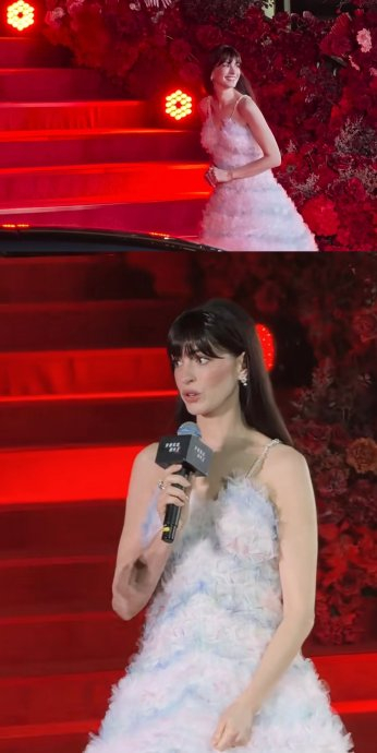 粉蓝色绉纱裙摆在上海的夜风中翩然展开,安妮·海瑟薇以一句字正腔圆的中文“谢谢”点燃全场沸腾,泪光闪烁间,她将二十年中国观众的陪伴凝成红毯上最动人的告白。