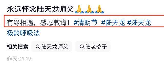 4月5号,知名网红陆天龙的徒弟分享了一组悼念师父的画面,由此揭开了这段噩耗。紧接着没有多久,陆天龙的儿子便在视频账号上证实了老爷子的死讯,不过关于具体的时间,他并没有透露。