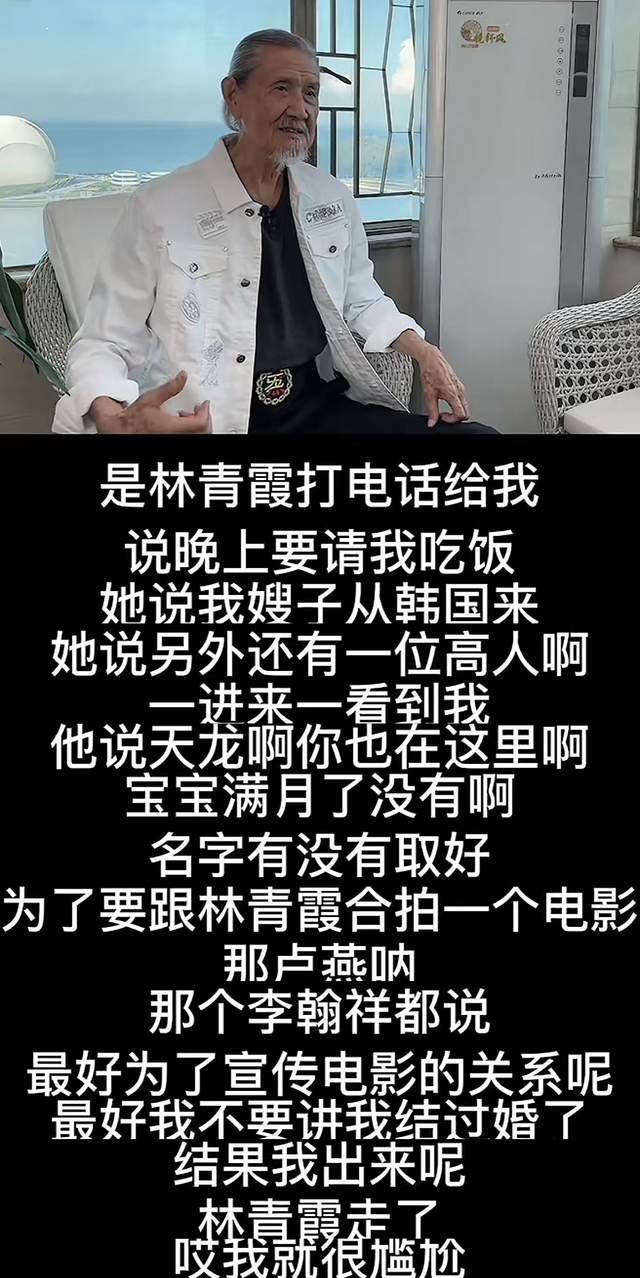 陆天龙生前曾分享视频透露与林青霞约会吃饭的一些细节,当时陆天龙打算与林青霞合作一部电影,李翰祥(林青霞的伯乐)称陆天龙单身且没有孩子。