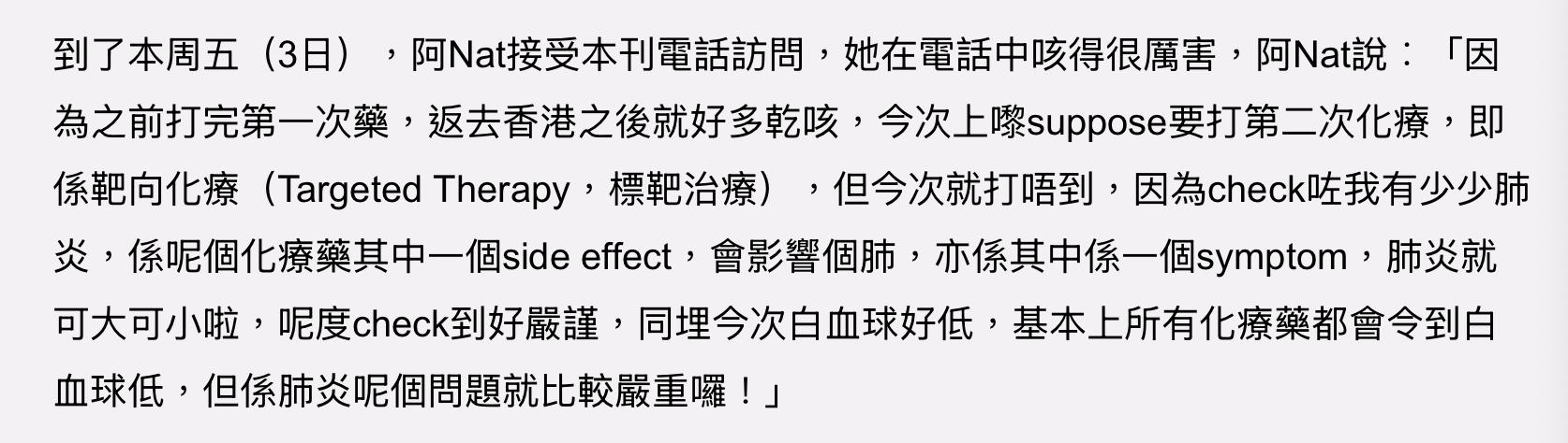 吴文忻表示患上肺炎大概是因为吃了新的标靶药的关系。早前她试了一个新药,是第一次用,所以也不知道对身体有什么状况。在用了药之后,她称状况有所好转,至少整个人都精神了不少,不过用药之后一直咳嗽不止——在受访的时候她持续干咳。如果证实是这个药引发的副作用——肺炎,很大程度就不能继续用,未来又要继续寻找新药。原本她这一次来深圳的医院是要做第二次的化疗,结果因为肺炎,只能停止化疗,而转为做肺炎的治疗。虽然未能做化疗,不过吴文忻对深圳医院的治疗还是给予了好评,称当地医院很严谨,检查仔细,自己也很放心。
