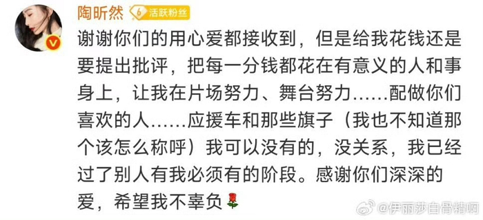 #陶昕然 给我花钱要提出批评#很明显姐姐不希望爱会变成负担,要花钱花时间精力应援