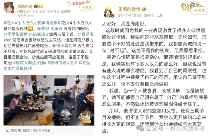就拿《花少6》中的夜谈名场面来说,在艺人看来可以通过这一part塑造温柔随和的知心大姐姐形象,在节目组看来是一次暖心的破冰会话。但精通“花学”的观众则将其理解为费尽心机的“陈好批判大会”,艺人周雨彤也凭借“典型NPD人格”火速出圈。