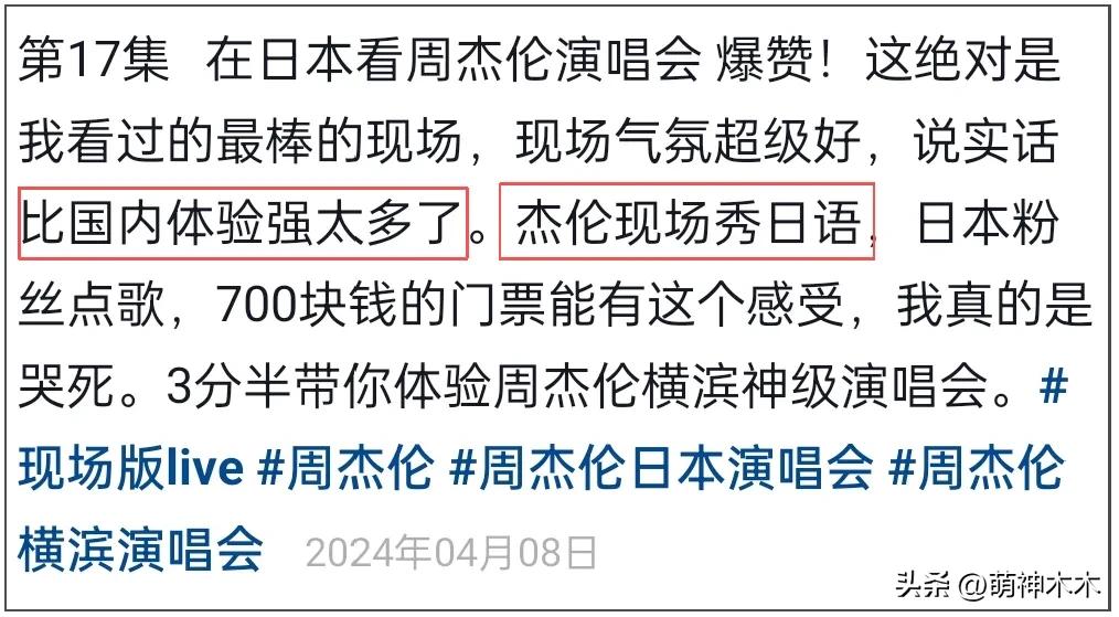 对比中日两地粉丝的演唱会反馈,能明显看到周杰伦对日本演唱会更上心,粉丝们也直言比国内体验感强太多,称周杰伦不仅现场秀日语。还能唱高音。