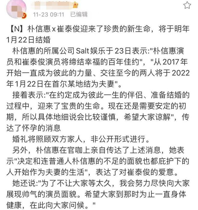 朴信惠所属经纪公司23日表示「演员朴信惠和崔泰俊演员将结为百年之好」,「从2017年开始相恋的二人将于2022年1月22日(周六)在首尔结婚。」