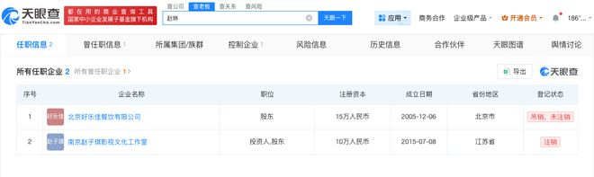 天眼查App显示,赵琳(赵子琪)名下关联2家企业,目前均已注销或被吊销,包括南京赵子琪影视文化工作室、北京好乐佳餐饮有限公司,赵琳(赵子琪)在上述企业担任投资人或持有股份。