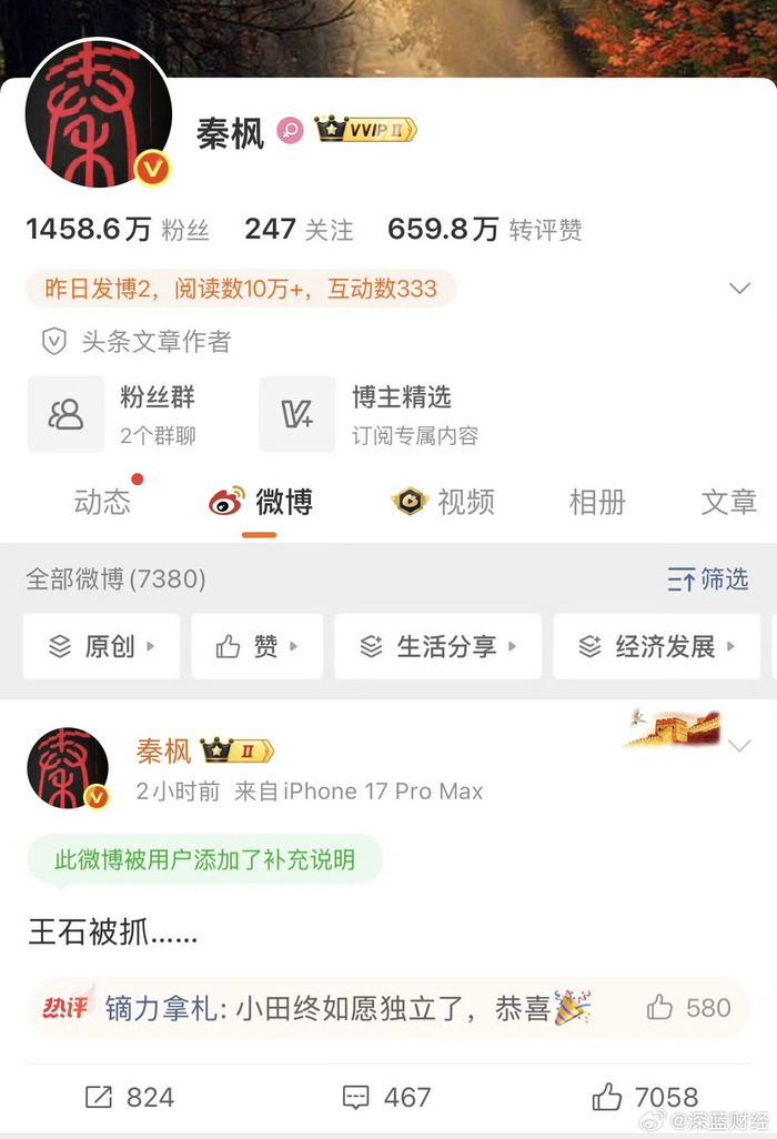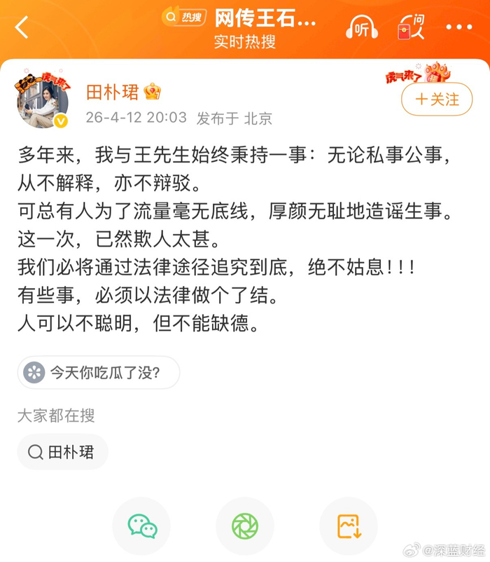 #王石 秦枫#王石、田朴珺双双辟谣后,时隔近4小时,知名记者秦枫删除了爆料微博