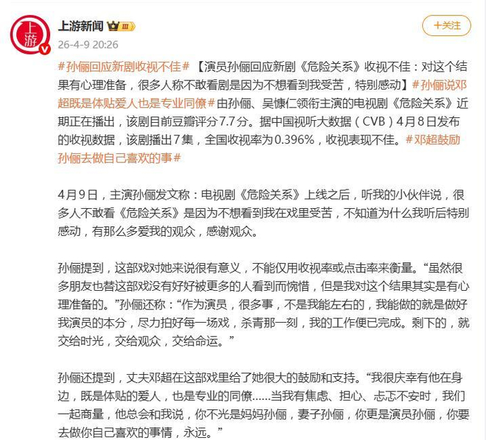 据4月9日报道,演员孙俪的一篇长文,将正在播出的电视剧《危险关系》推上了话题中心。面对该剧0.396%的全国收视率(CVB数据),这位曾经的“收视女王”没有回避,而是坦然写下:“我对这个结果其实是有心理准备的。”