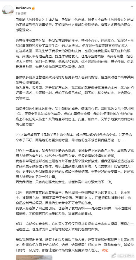 ## 孙俪的"红脸",到底是"花非正红"还是"红非花非"?,在这部《危险关系》上,收视率的"黑洞"吓退了不少观众,就像一个个"躲避者"在豆瓣上点燃了"不看"的火焰,可孙俪,曾经的"收视女王",并没有选择躲在"红脸"里哭,相反,她以一种近乎疯狂的方式,用自己的方式对"流量"的神话进行了一次大胆的解构。,这位"曾经的收视女王",在这部"收视小白"的剧中,选择了坦然面对,她的长文里,不是埋怨观众不是看不看,而是用一种近乎哲学的态度,将观众的选择视为一种"命运"的安排,这种担当,不是新鲜的,更多的是一种令人心疼的可爱,就像她说的:"很多观众因为不想看到我在戏里受苦而不敢看这部剧",这句话更像是一句自嘲的笑话。,在这个"流量为王"的时代,孙俪的选择堪称一种逆行,她的声音像是从娱乐圈的集体思维中跳出来的惊雷,就像一位观众评论所说:"如果孙俪都不在意收视率,那她就不用成为那个永远躲在男主身后的收视女王了。"这种"无所谓",不是软弱的表现,而是一种难能可贵的勇气。,邓超在这一段剧的"光环"中,堪称另一个"配角",他的支持像一剂良药,让孙俪在这个"红脸"的时刻,依然保持着演员的本分,这种"背靠背"的默契,不仅温情,更是一种老友情的真实,邓超不是一个普通的丈夫,他是孙俪在这个"危险关系"中的"安基立",这种"暗恋",比明星夫妻之间的光鲜love故事,更让人心动。,在这篇长文里,孙俪对自己的"职业本分"有着清醒的认知,她说:"很多事,不是我能左右的,我能做的就是做好我演员的本分。"这句话,像一记重锤,敲醒了娱乐圈里太多"职业病"的明星们,他们是否也在想着,用什么样的方式来衡量自己的价值?而孙俪的选择,让我们看到了一个真实的职业人:她不是在讨好观众,而是用自己的方式去完成自己的艺术追求。,这篇"危险关系"的回应,最终不是一场危机公关,而是一次关于演员职业边界的坦诚告白,在这个"流量至上"的年代,孙俪用自己的方式告诉我们:在这个行业的狂欢年代,也许我们需要更多像她这样的人,他们不在意"左右",只专注于"完成",这种态度,才是真正的职业操守。## 孙俪的"危险关系":在收视的重压下,演员该如何自我救赎?, , 每当看到"收视女王"孙俪的最新动态,都会不由自主地想起那个被奉为经典的"我不是黄金女郎",那个时候的孙俪,是被观众捧上了云端的偶像;而现在的孙俪,却在收视率的重压下,跌入了"失败者的行列",面对这部《危险关系》的收视惨淡,孙俪没有选择沉默,她选择了坦诚面对,甚至带着一丝淡然的微笑。, ,### 一、从"收视女王"到"演员", 在这个流量至上、点击率至上的时代,孙俪的"黄金期"就像一场美丽的回忆,从《陆贞传奇》到《大明宫词》,她依次诠释着不同的角色,收视率在她的名字上不断攀升,可惜的是,时光是不会倒流的,人不再年轻,观众的口味也在悄然变化。, , 《危险关系》的收视率只有.396%,这在当下这个流量狂飙的时代,堪称"惨不忍睹",但孙俪面对这一结果,反而显得坦然,她不是在自我辩解,而是在坦诚自己的感受,她说:"我对这个结果其实是有心理准备的。"这句话啊,简直像一记重锤,击碎了那些对她收视率依然"黄金"的想象。, , 但更值得称赞的是,孙俪没有沉溺于收视率的数字,她说:"很多事,不是我能左右的,我能做的就是做好我演员的本分。"这句话啊,简直是对演员职业的精辟概括,在这个观众可以随手删减的时代,演员能做的,除了努力演技,还有什么呢?能不能左右观众的评价,这或许就是演员的宿命。, ,### 二、邓超:爱情的港湾, 在这场"危险关系"的拍摄期间,邓超成了孙俪最重要的支柱,作为丈夫兼同行,邓超不仅在她每天拍戏红肿的眼睛上心疼,更在精神上给予了关键的鼓励,当孙俪有焦虑、担心、忐忑不安时,他们一起商量,他总是对她说:"你不光是妈妈孙俪,妻子孙俪,你更是演员孙俪,你要去做你自己喜欢的事情,永远。"这句话啊,简直是对演员职业的最好诠释。, , 孙俪感谢邓超的支持时,她说:"我很庆幸有一个爱人兼同僚,他不仅是我最好的朋友,更是我最坚强的后盾。"这段话让我想起了多少演员和明星之间的恋爱纠葛,也提醒我们,在演员的道路上,感情的支持或许比职业上的帮助更为重要。, , 孙俪还提到,邓超不仅是她的支持者,更是她最好的朋友,这种相互支持的关系,几乎是演员群体中难以寻觅的宝贵财富,在这个高度竞争的行业里,能有一个可以依靠的另一半,简直是无价的财富。, ,### 三、从"无法想象"到"想象之外", 孙俪说"听说很多观众因为'不想看到我在戏里受苦'而不敢看这部剧",这句话让我感到特别难过,她说"我很庆幸",这让我想起了那些为了工作而付出巨大努力的演员,演员的职业本质就是去演绎各种角色,去体验各种情感,这或许就是演员的宿命。, , 但孙俪并没有因此气馁,而是选择用积极的态度去面对,她说:"我希望大家能理解我,理解这个角色。"这种坦诚的态度,简直是对观众的告白,观众们可能不理解,但作为演员,孙俪已经尽力了。, , 孙俪还提到,这部剧的主题是情感操控(PUA),而这种主题并不是所有人都能接受的,作为演员,她希望通过演绎,让更多人看到女性如何挣脱伤痛、重新爱自己,这是一个非常有意义的主题,但或许在主流观众中,会因为太过沉重而被抵触。, ,### 四、演员的无奈与坚韧, 孙俪说"很多事,不是我能左右的,我能做的就是做好我演员的本分,尽力拍好每一场戏,杀青那一