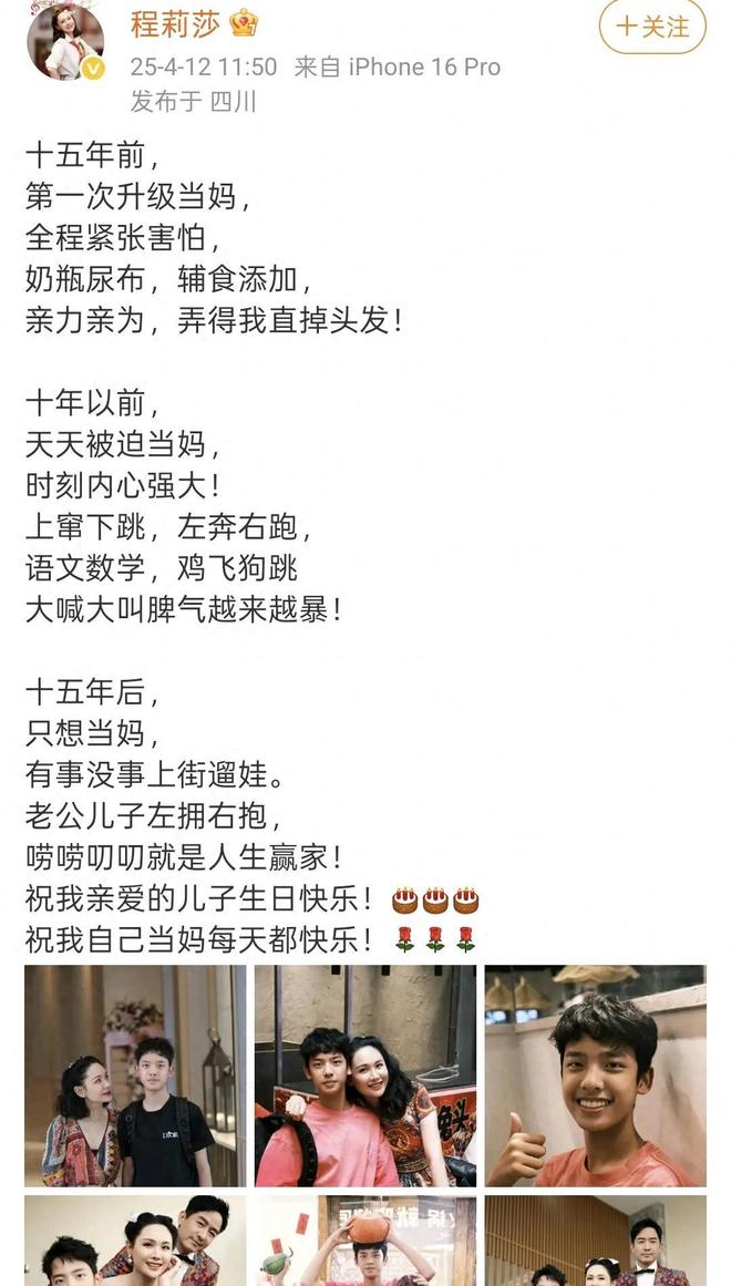 程莉莎的儿子郭子诚迎来了15岁生日,母爱满满的程莉莎也在社交平台上发文晒照为儿子庆生,与此同时,父爱如山的郭晓东还在兢兢业业的营业中。
