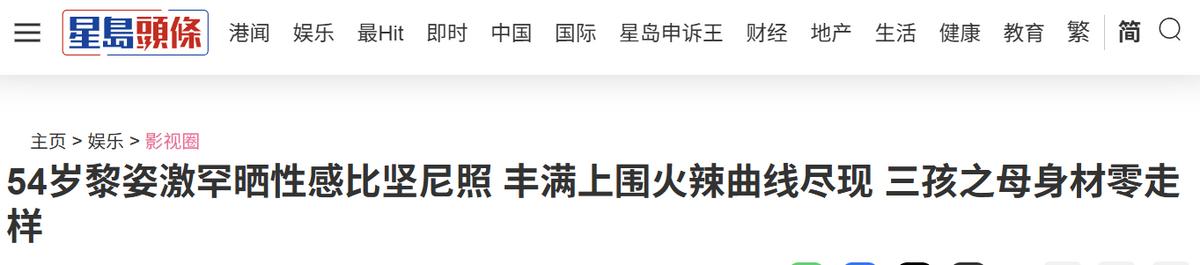 《54岁黎姿激罕晒性感比坚尼照 丰满上围火辣曲线尽现 三孩之母身材零走样》(星岛头条)、