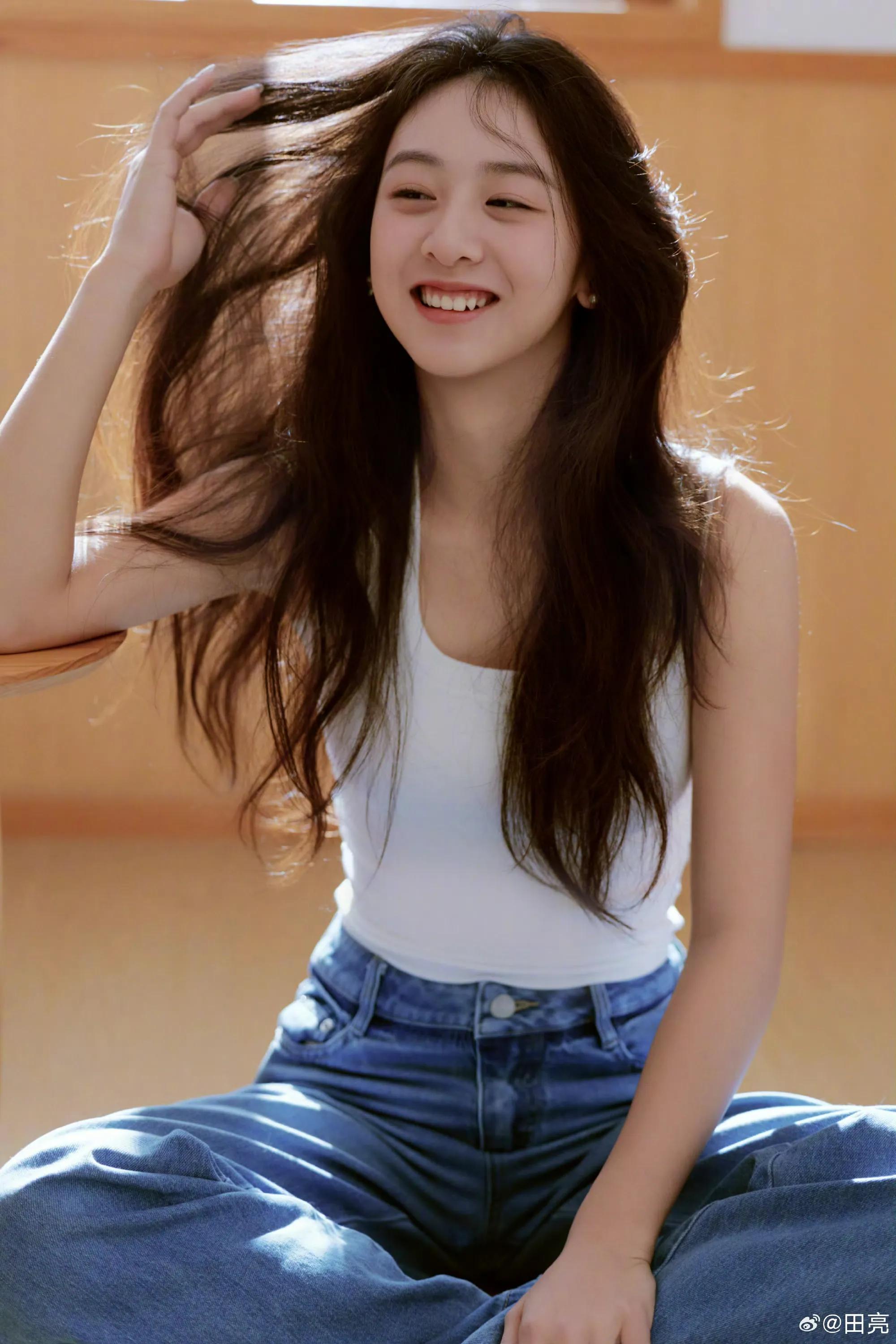 田亮晒出的一组写真中,森蝶披着一头长卷发,身穿白色背心搭配牛仔裤,打扮清爽自然,尽显青春活力。她坐在卧室地板,面带灿烂笑容,看起来好漂亮,元气少女感十足。