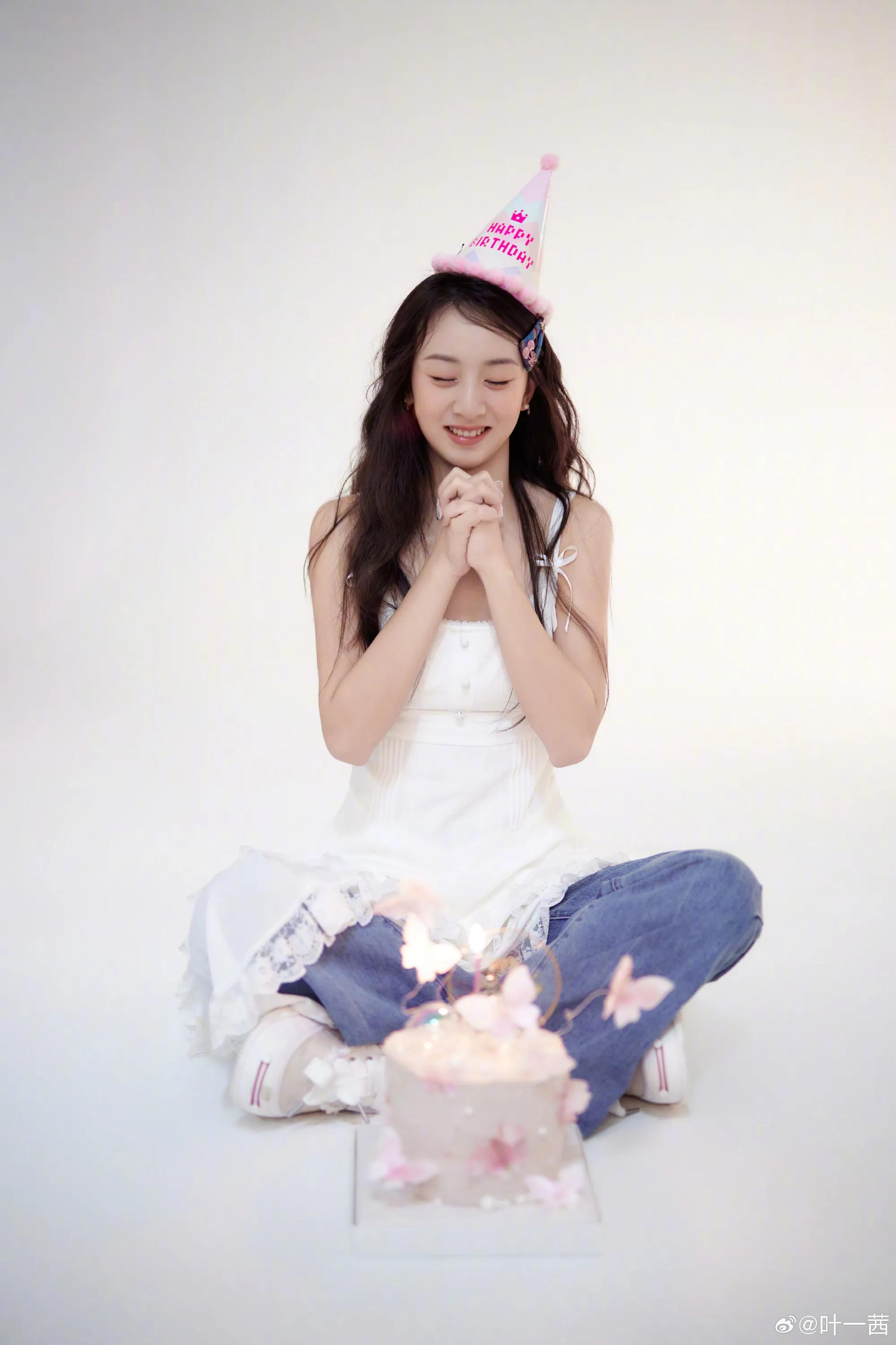 叶一茜晒出的是另外一套造型的写真,森蝶身穿白色连衣裙搭配牛仔裤,混搭风格就像森蝶本人一样甜酷少女感十足,充满青春活力。森蝶头戴粉色生日帽,或拿着气球,或对着蛋糕许愿,真的好欢乐。