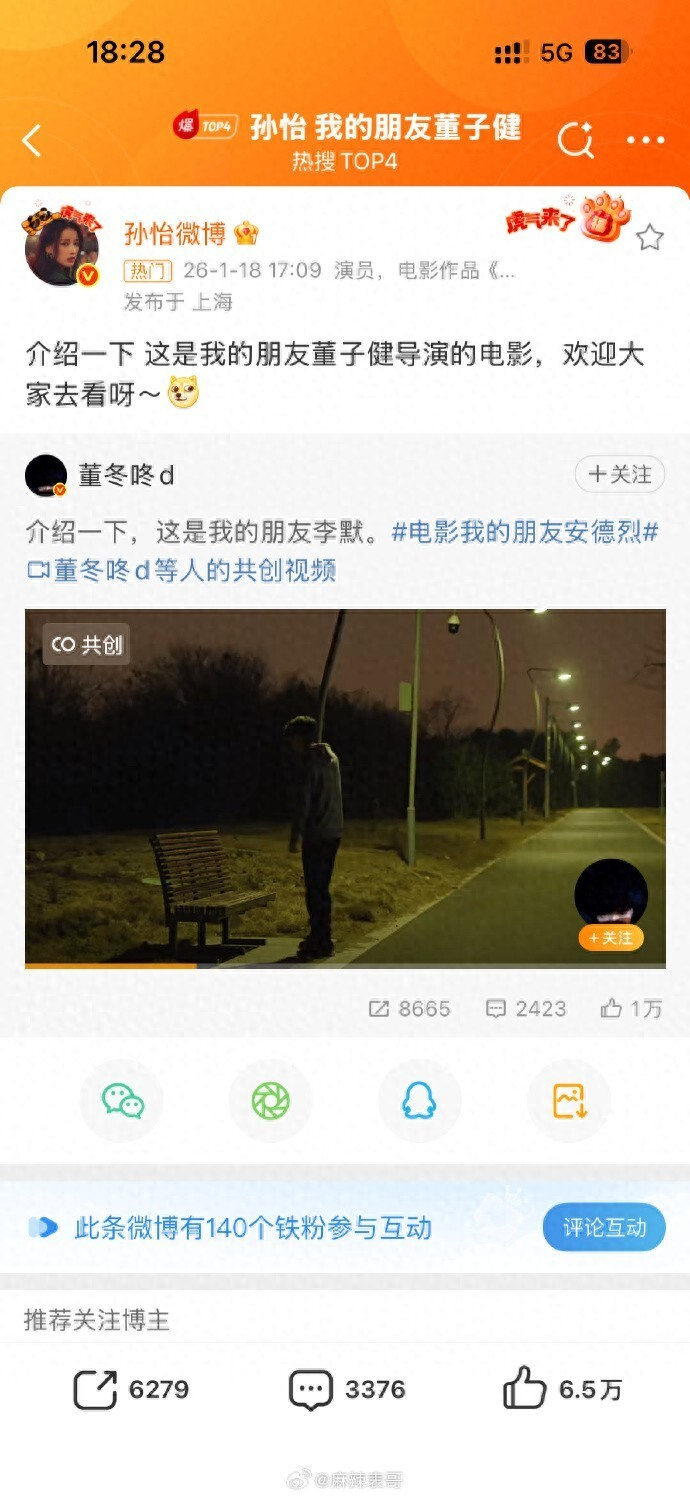 1月18日下午,一场简短而克制的微博互动,为内娱离婚叙事提供了一个罕见的温和样本。17:09,孙怡在个人微博转发宣传前夫董子健导演的新片《我的朋友安德烈》,配文写道:“这是我的朋友董子健导演的电影。”半小时后,董子健本人在评论区现身,以同样的称谓回应:“谢谢你,我的朋友。”这不足三十字的往来,是两人自2022年8月宣布和平分手后的首次公开对话,迅速点燃网络。