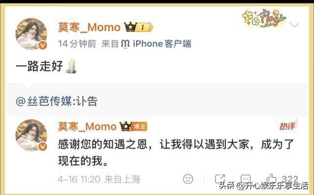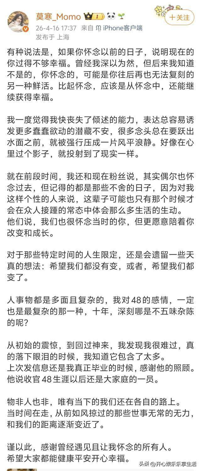 莫寒发文感谢王子杰的知遇之恩,让她得以遇到喜爱她的粉丝们,也成就了现在的她。她还在后续发布的长文中进一步流露情感,回忆在SNH48时期的青春岁月,称那段经历是“再也无法复刻的另一种鲜活”,并感慨对48系的情感“五味杂陈”,最后写道:“上次发信息还是我真正毕业的时候,感谢他的照顾。”